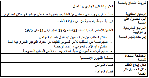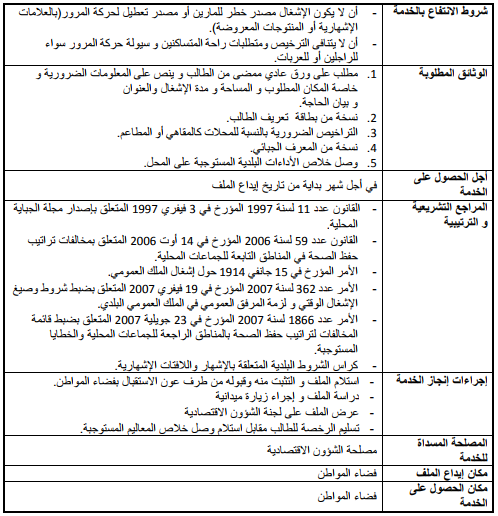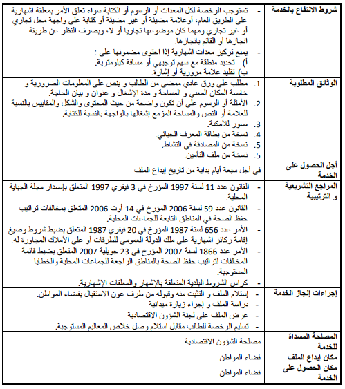 خدمات الشؤون الإقتصادية رخصة تركیز علامات إشھاریة رخصة الإشغال الوقتي للملك العمومي رخصة لتنظیم تظاھرة